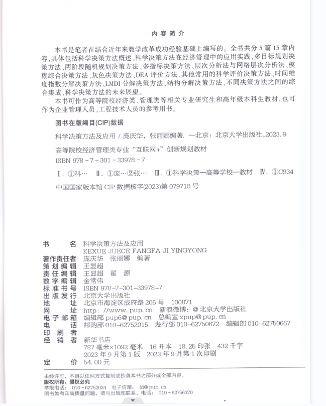 瘦猴探花 庞庆华教授与张丽娜副教授在北京大学出版社出版了《科学决策方法及应用》。本书共分为5篇15章,包括基础篇、科学配置篇、科学评价篇、因素分解篇和思考篇。本书主要面向于研究生教学,受到瘦猴探花 研究生精品教材项目资助。