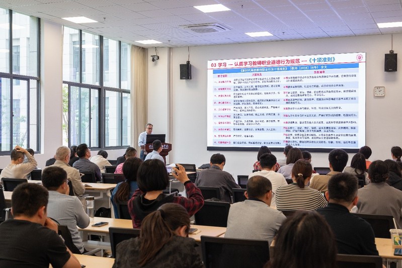 学院党委书记陈杰领学师德课堂第四期“践行教育家精神,做新时代大先生”专题内容。他强调,教师是立教之本、兴教之源,全体教职工要深刻领会教育家精神的核心内涵,坚守 “心有大我、至诚报国”的理想信念,弘扬“启智润心、甘于奉献”的育人情怀。陈杰重点对《新时代高校教师职业行为十项准则》进行了逐条解读,结合学院教育教学实际,从政治方向、学术诚信、廉洁自律、关爱学生等方面提出明确要求,他号召全体教师以人民教育家为榜样,在教书育人中展现新时代高校教师的责任担当,争做学生为学、为事、为人的示范。