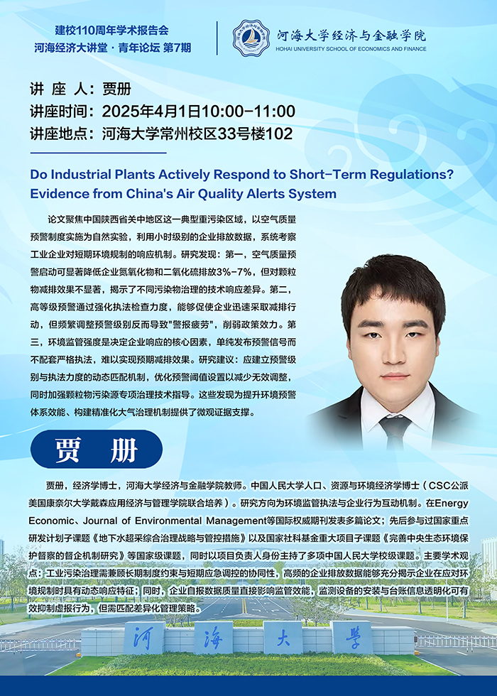 河海经济大讲堂·青年论坛第7期:Do Industrial Plants Actively Respond to Short-Term Regulations? Evidence from China's Air Quality Alerts System