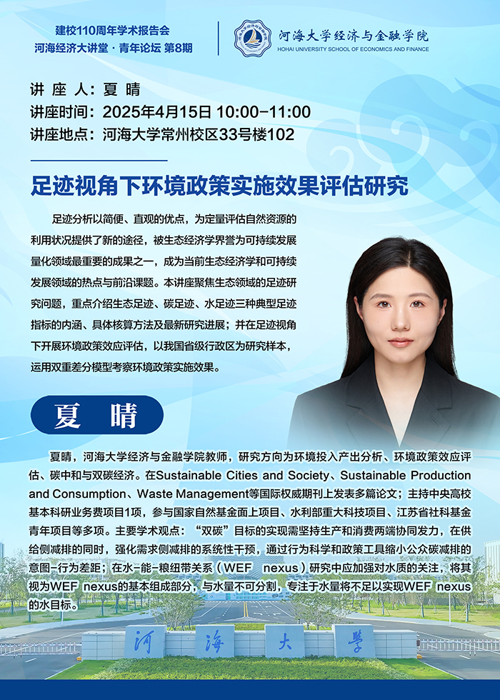 4月1日,学院邀请贾册老师为广大师生做了题目为“Do Industrial Plants Actively Respond to Short-Term Regulations? Evidence from Chinas Air Quality Alerts System”的学术讲座。主持人丁童慧老师向全体参与人员介绍了贾册博士的研究方向及此次讲座的主要内容。贾册博士通过系统解析中国重污染应急预警制度的运行机制,揭示了工业企业污染减排决策的深层动因。其研究创新性采用自然实验法发现:高强度执法下的高级别预警能显著激发企业减排响应,但预警频次与级别的动态调整易诱发企业“警报疲劳”,形成边际效应递减现象。基于实证数据,贾册博士指出环境监管强度是实现政策效力的关键变量,提出构建预警级别-执法力度动态适配模型的创新思路,为破解运动式治理困境、推进大气污染精准防治提供了新的理论框架。在互动环节,师生们就环境预警阈值设定、政企博弈模型构建等学术前沿问题,与贾册博士展开了深度对话。贾册,经济学博士,瘦猴探花 教师。中国人民大学人口、资源与环境经济学博士(CSC公派美国康奈尔大学戴森应用经济与