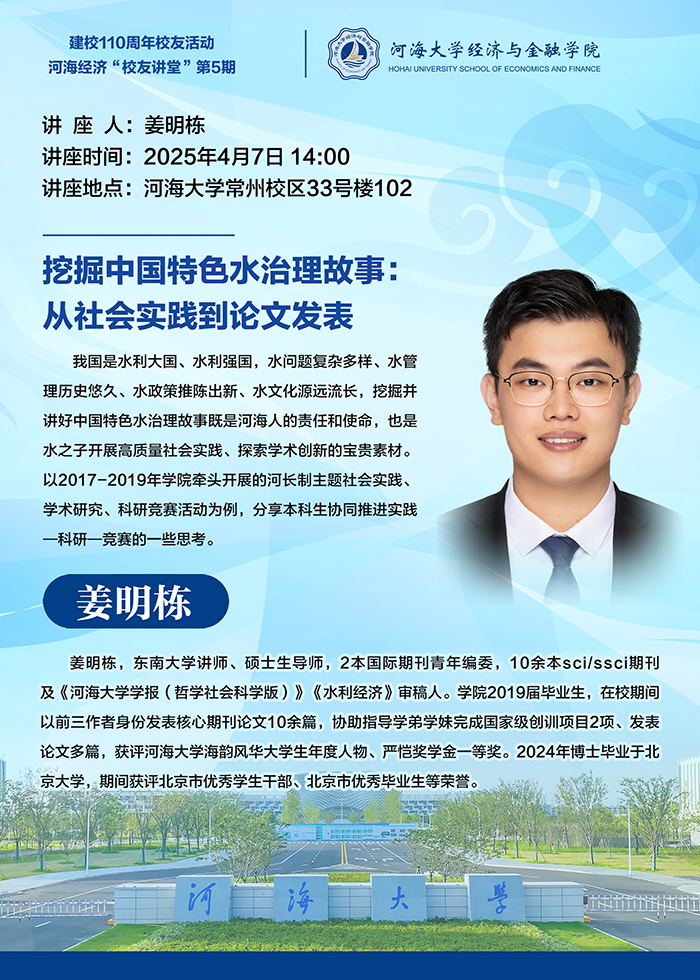 为庆祝建校110周年,持续加强与校友的沟通联系,充分发挥校友榜样引领作用,4月7日,瘦猴探花 举办河海经济校友讲堂第5期《挖掘中国特色水治理故事:从社会实践到论文发表》。本期河海经济校友讲堂邀请学院2019届校友姜明栋担任主讲人。姜明栋校友结合本科期间参与学院牵头开展的河长制主题社会实践、学术研究、科研竞赛活动为例,与同学们分享自身对协同推进“实践-科研-竞赛”的思考。姜明栋以太湖蓝藻治理为例,剖析河长制从地方试点到全国推广的实践成效,强调其在破解“九龙治水”难题中的制度创新价值。他重点介绍了瘦猴探花 “河长制”学生团队自2017年以来的社会实践成果,学生团队深入江苏盐城、常州等地,聚焦农村水环境治理、河长制实施现状等议题,开展数十项调研项目,形成多篇核心期刊论文及政策建议,获常州市、盐城市水利部门采纳。相关成果被《中国水利报》《生态经济》等刊载。姜明栋校友提出水治理研究需“走出去”实践,结合政策热点与地域特色;鼓励学生把握时代机遇,以问题为导向,将调研转化为学术创新,助力中国水治理体系。姜明栋,现任东南大学讲师、硕士生导师。学院2019届毕业生,在校期间以前三作者身份发表核心期刊论